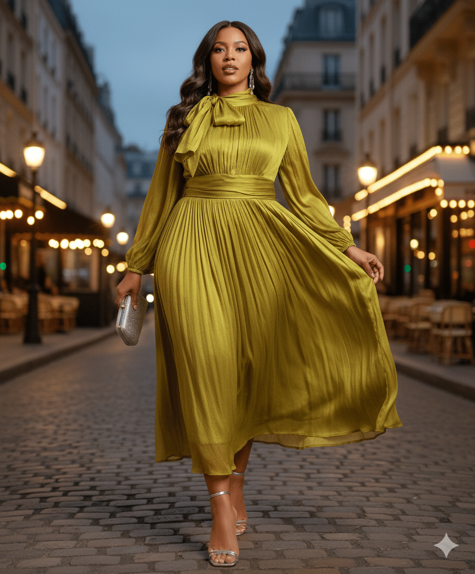 robe longue plissée en satin vert olive offre une allure chic et moderne. Son col noué, sa taille marquée et ses manches longues ajoutent une touche de sophistication. Fluide, confortable et élégante, elle est idéale pour les cérémonies, soirées et événements où vous souhaitez briller avec classe.